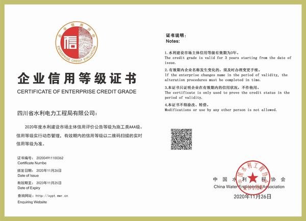 水利建設市場主體信用AAA證書