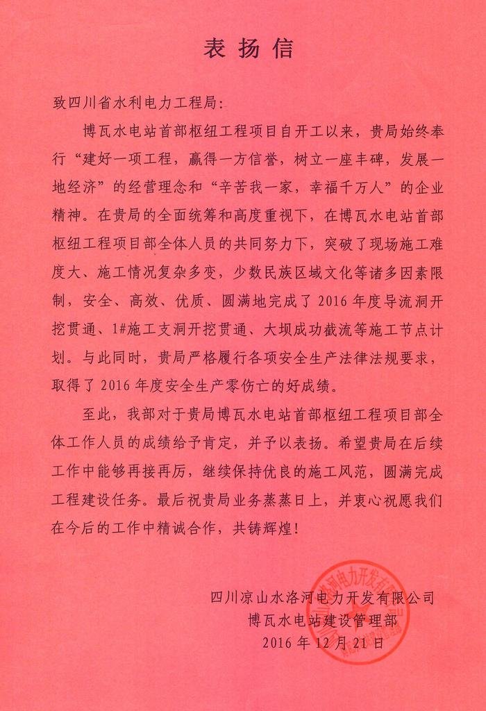 博瓦水電站建設(shè)管理部致工程局表?yè)P(yáng)信