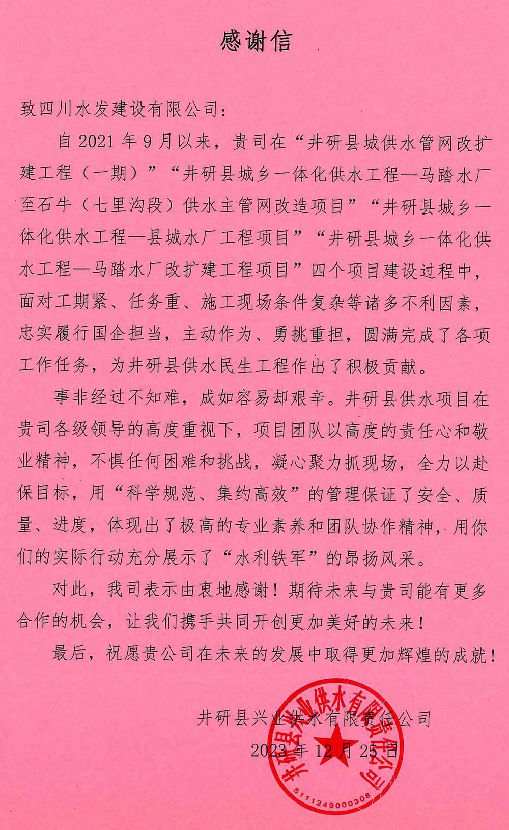 井研縣興業(yè)供水有限責(zé)任公司致建設(shè)公司感謝信