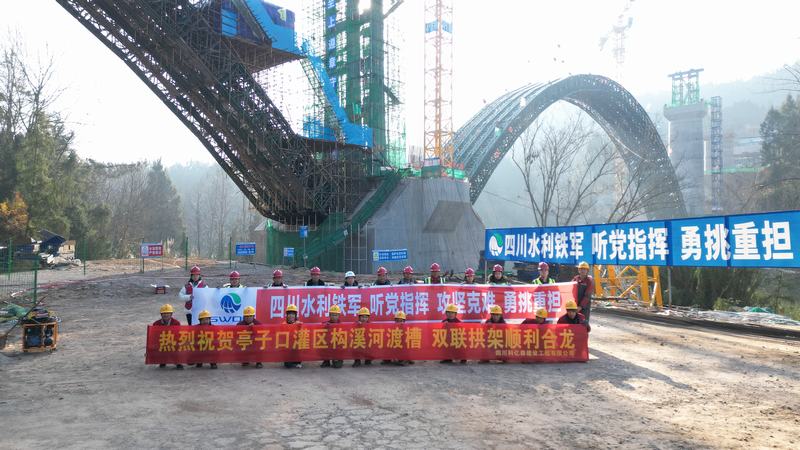 構(gòu)溪河渡槽作為四川省內(nèi)流量和跨度最大的變截面箱型拱結(jié)構(gòu)渡槽,其雙連拱懸拼拱架的成功安裝,證明了懸拼拱架結(jié)構(gòu)在大型渡槽上應(yīng)用的可行性,為水利行業(yè)類似項目的開展提供了指導(dǎo)意義。為順利實現(xiàn)該節(jié)點目標(biāo),三分公司亭子口項目部面對工期緊、任務(wù)重、施工難度大,始終堅持黨建引領(lǐng),制定了專項施工方案,同時多次召開專題會議,從責(zé)任分工、工序銜接、設(shè)備原材料供應(yīng)、安全質(zhì)量控制及后勤保障等方面著手不斷加強(qiáng)施工過程的協(xié)調(diào)與管控,細(xì)化節(jié)點,倒排工期,確保了該雙連拱懸拼拱架順利完成合龍。