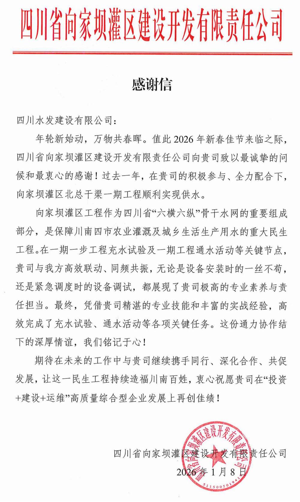 近日,公司收到來(lái)自四川省向家壩灌區(qū)建設(shè)開(kāi)發(fā)有限責(zé)任公司的感謝信,信中對(duì)機(jī)電安裝分公司在向家壩灌區(qū)一期一步工程充水試驗(yàn)、通水活動(dòng)等各項(xiàng)關(guān)鍵任務(wù)中展現(xiàn)出的卓越能力與鐵軍風(fēng)范予以高度贊譽(yù)。
