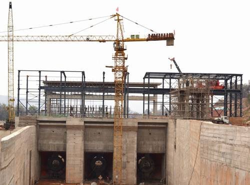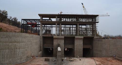2、廠房取水口一期砼澆筑完成,現正進行閘門金結安裝。廠房1#機、2#機主機段一期砼澆筑到1915.9m高程(發電機層設計高程1915.9m高程,其上為鋼排架,一期砼澆筑完成),管型座二期砼澆筑完成;3#機主機段一期砼澆筑到1915.9m高程,管型座二期砼澆筑到1912.1m高程(水機層設計高程1913.1m高程)。副廠房一期砼澆筑到1915.9m設計高程,澆筑完成。廠房下游尾水閘室一期砼澆筑完成,現正進行閘門金結安裝。