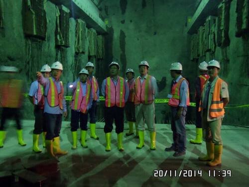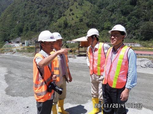 2014年11月21日,中國水利電力對外公司總經理王禹在總經理辦公室主任池黎、財務部主任程書權、經營部主任王乃倫、中水南美公司總經理王劍鋒、副總經理趙曉明、中水厄瓜多爾TP項目部經理衛云的陪同下,視察我局承建的厄瓜多爾TP項目取水口閘壩工地和地下廠房工程。