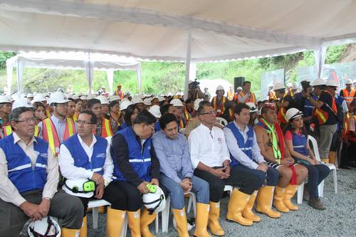 14時10分,在厄瓜多爾TP水電站pilaton取水口舉辦的截流儀式正式開始,厄瓜多爾副總統(tǒng)、戰(zhàn)略部長、電力部長、業(yè)主總經(jīng)理、建設(shè)、設(shè)計、監(jiān)理、施工負(fù)責(zé)人,以及厄瓜多爾媒體、學(xué)生團(tuán)隊等近300人參加了截流儀式。